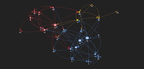 Para ficar mais claro, observe a imagem abaixo, onde cada ponto é uma pessoa dentro da organização e os demais pontos que os conectam são os principais indivíduos que possuem maior comunicação. Além da visão de quem se comunica mais com quem, podemos construir a ONA a partir da percepção dos funcionários frente a outros temas.